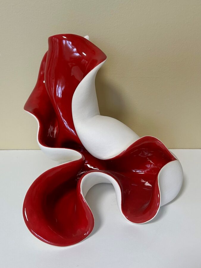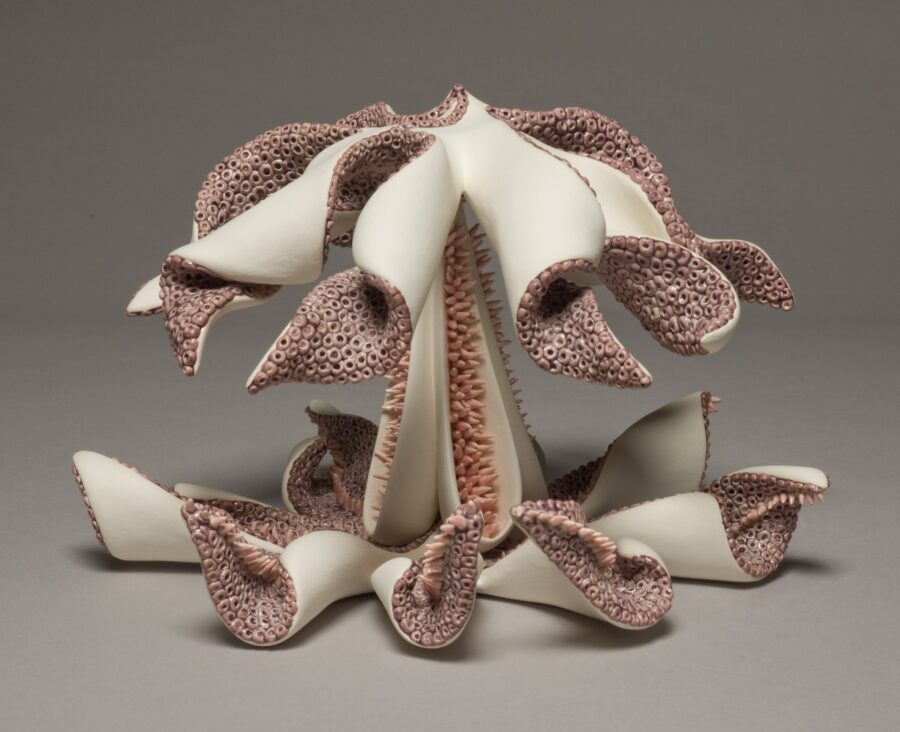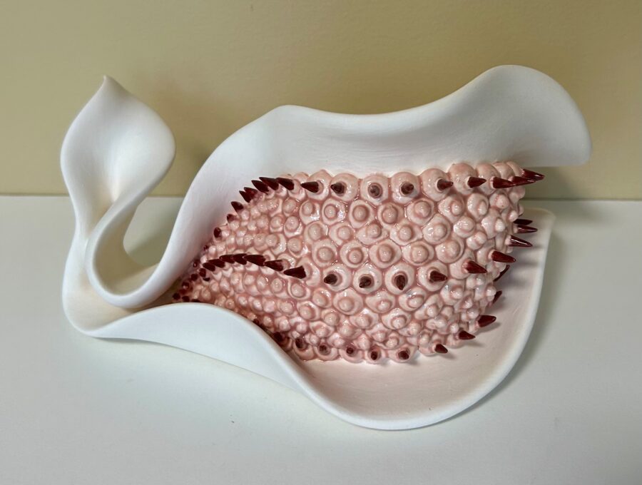 My current work is inspired by the dangerous and alluring beauty of carnivorous plants and poisonous underwater creatures. These seductive and deadly forms readily become metaphors for our culture’s inherent mistrust of female empowerment and common fears regarding gender fluidity. My work explores the tension of binary restrictions that create an artificial separation between feminine and masculine qualities. Sensual, undulating forms depict an ambiguous mix of anatomical features, alluding to the dynamic and perpetual act of becoming one’s gender. I seek to embrace dualities through the morphing of seemingly incongruous attributes to form new identities that are at once familiar and strange, mysterious and beguiling. I hope that upon seeing this work, observers will have mixed feelings of apprehension and intrigue. The shiny pops of color and meticulous textural elements beckon a closer look, while spiny projections and visceral crevices and folds may make one second guess the initial desire to touch. I hope this subtle tension between viewer and object will encourage observers to question the nature of their fears and desires and contemplate assumptions regarding beauty, gender, and sexuality.