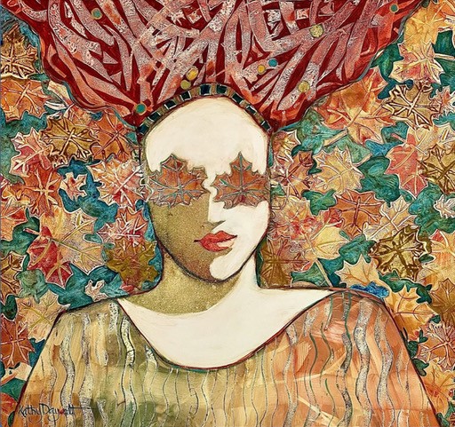 In 2011 Daywalt began to revisit her original art interest – watercolor. She has been studying the effects of the medium on Yupo, polypropylene plastic, originally used for permanent outdoor signs. Her interest in figures and beautifully patterned compositions is evident in these new works. More importantly, her long experience with linocut printmaking has carried over to this new endeavor as she employs artist-made linocut stamps as well as found objects to create her richly textured, patterned paintings.